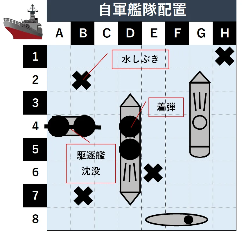 基本ルールは非常に明快。 まず、プレイヤーは自分の図面に決められた数の艦船を配置します。 艦船は縦または横一列に配置し、斜めに置くことはできません。 また、船同士を隣接させてはいけないというローカルルールが一般的ですが、これにより「周囲1マスは空白のはずだ」という推論が生まれます。 艦船の配置は絵の方がわかりやすく興奮度も上がりますが、代わりに文字を記ししても構いません。交互に座標を宣言し、そこに敵艦がいれば「着弾:命中(Hit)」、いなければ「水しぶき:ハズレ(Miss)」と報告し合います。 艦船のすべてのマスを攻撃されたら「撃沈(Sunk)」となります。