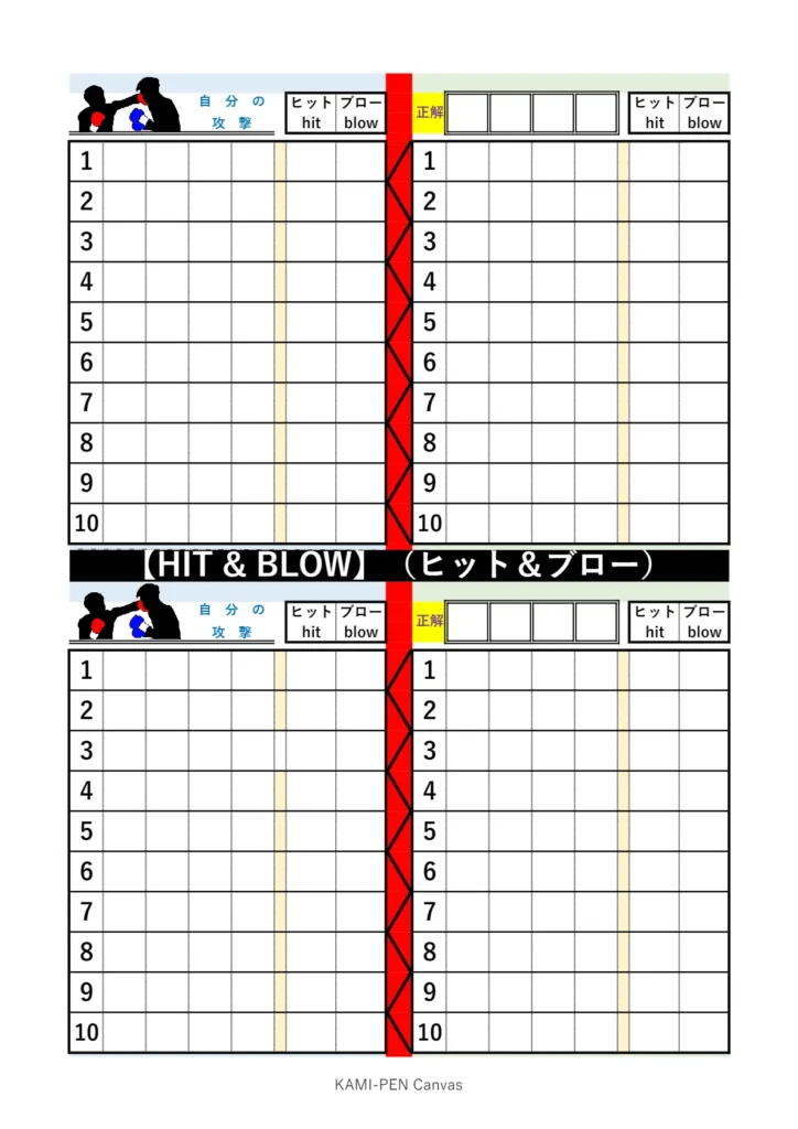 「さっそく遊んでみたい!」という皆様のために、KAMI-PEN Canvas特製のHIT & BLOW専用記録シート(PDF)をご用意しました。
