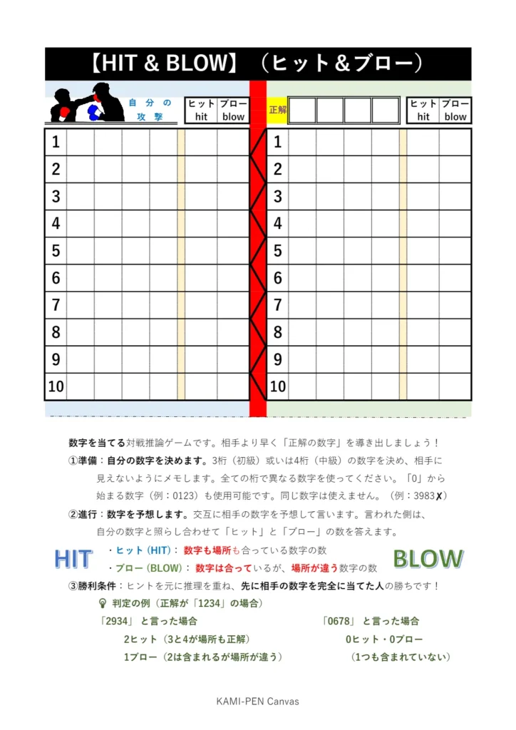 おすすめ!紙ペンゲーム【HIT & BLOW】(ヒット&ブロー)無料テンプレート|KAMI-PEN Canvas