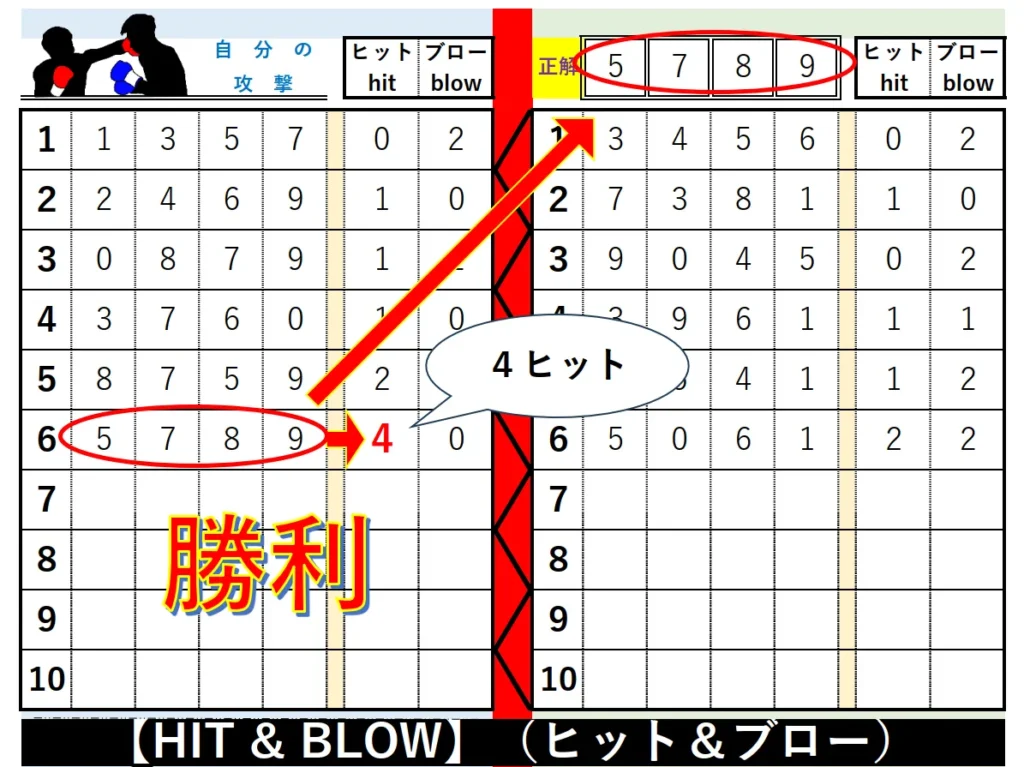 3. 宣言された側は、自分の秘密の番号と照らし合わせ、「ヒット」と「ブロー」の数を正確に伝えます。